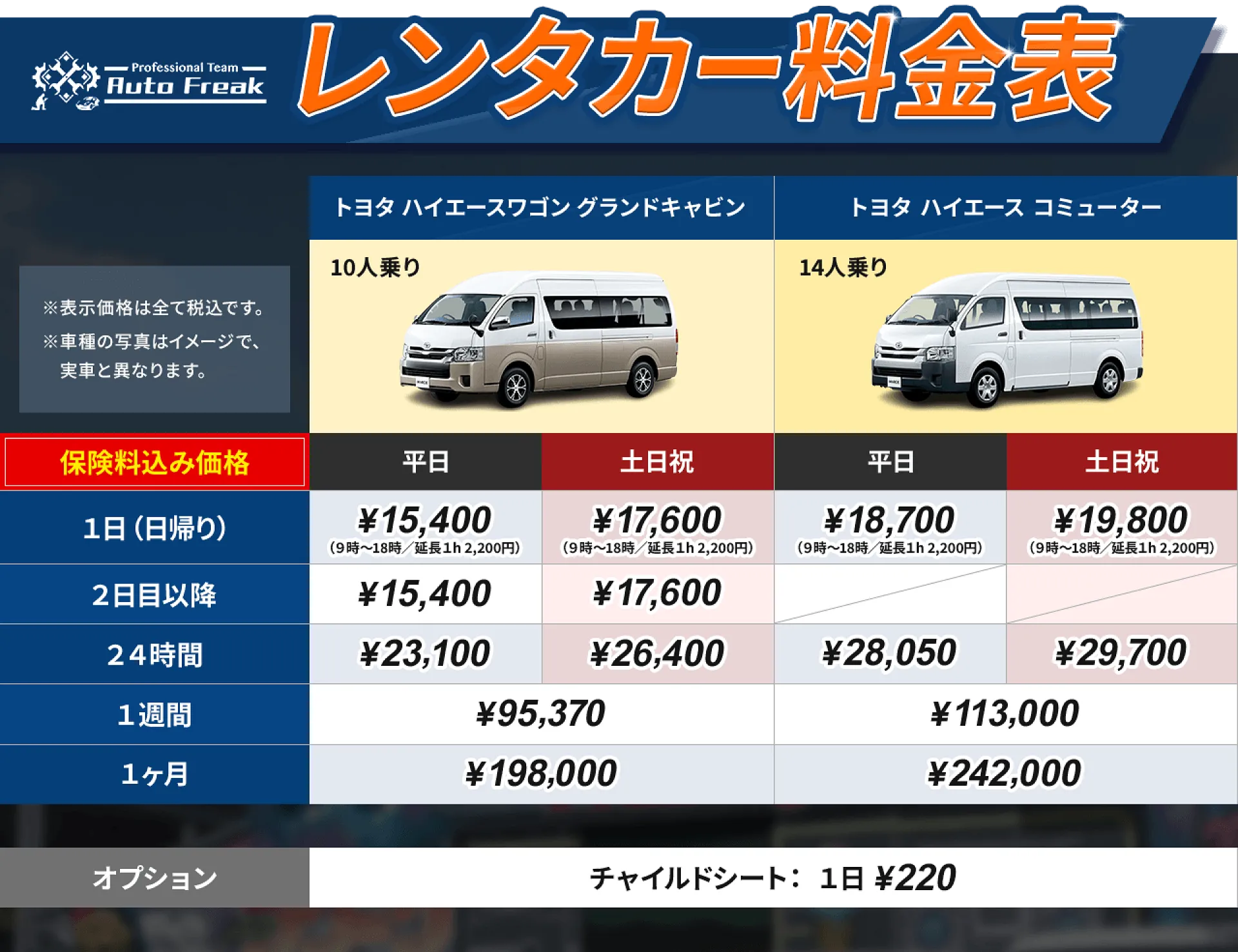 レンタル費用には保険料が含まれており、カーナビやETCなどが付属します。
